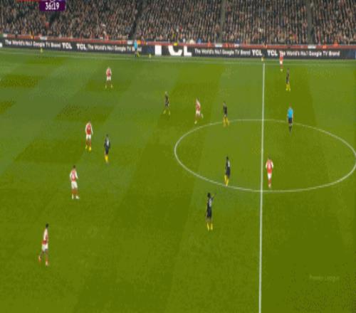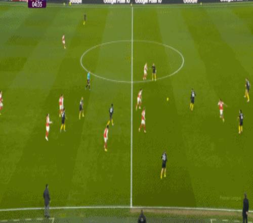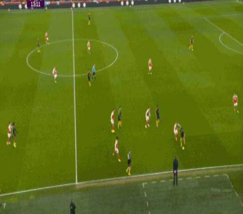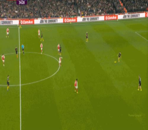 但这次进攻成型也有偶然性,因为阿森纳这一侧的中场和边后卫全部随着进攻球员压上去了,这是反击能出现的关键: