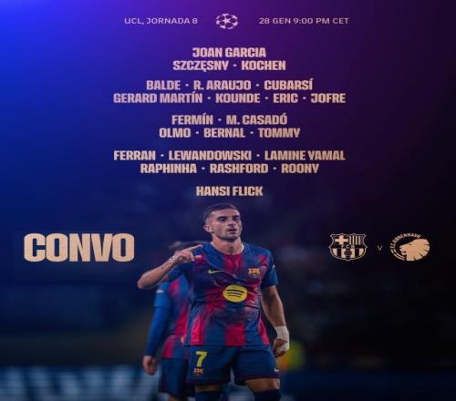 欧冠联赛阶段第8轮,巴塞罗那主场迎战哥本哈根。红蓝军团公布大名单,亚马尔、拉菲尼亚、莱万领衔,费兰回归,阿劳霍在列。 巴萨大名单 门将:霍安·加西亚、什琴斯尼、科琴 后卫:亚历克斯·巴尔德、阿劳霍、库巴西、赫拉德·马丁、孔德、埃里克·加西亚、托伦茨 中场:费尔明、卡萨多、奥尔莫、贝尔纳尔、托米·马克斯 前锋:费兰、莱万多夫斯基、亚马尔、拉菲尼亚、拉什福德、巴尔德吉