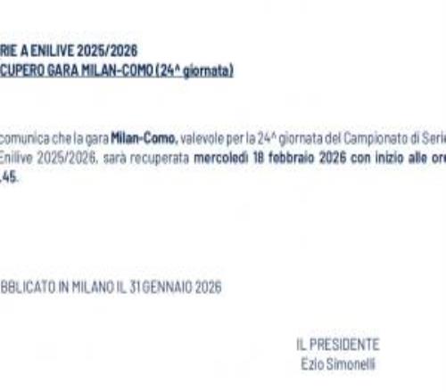 意甲官方:AC米兰主场对阵科莫的补赛将在2月19日0345进行